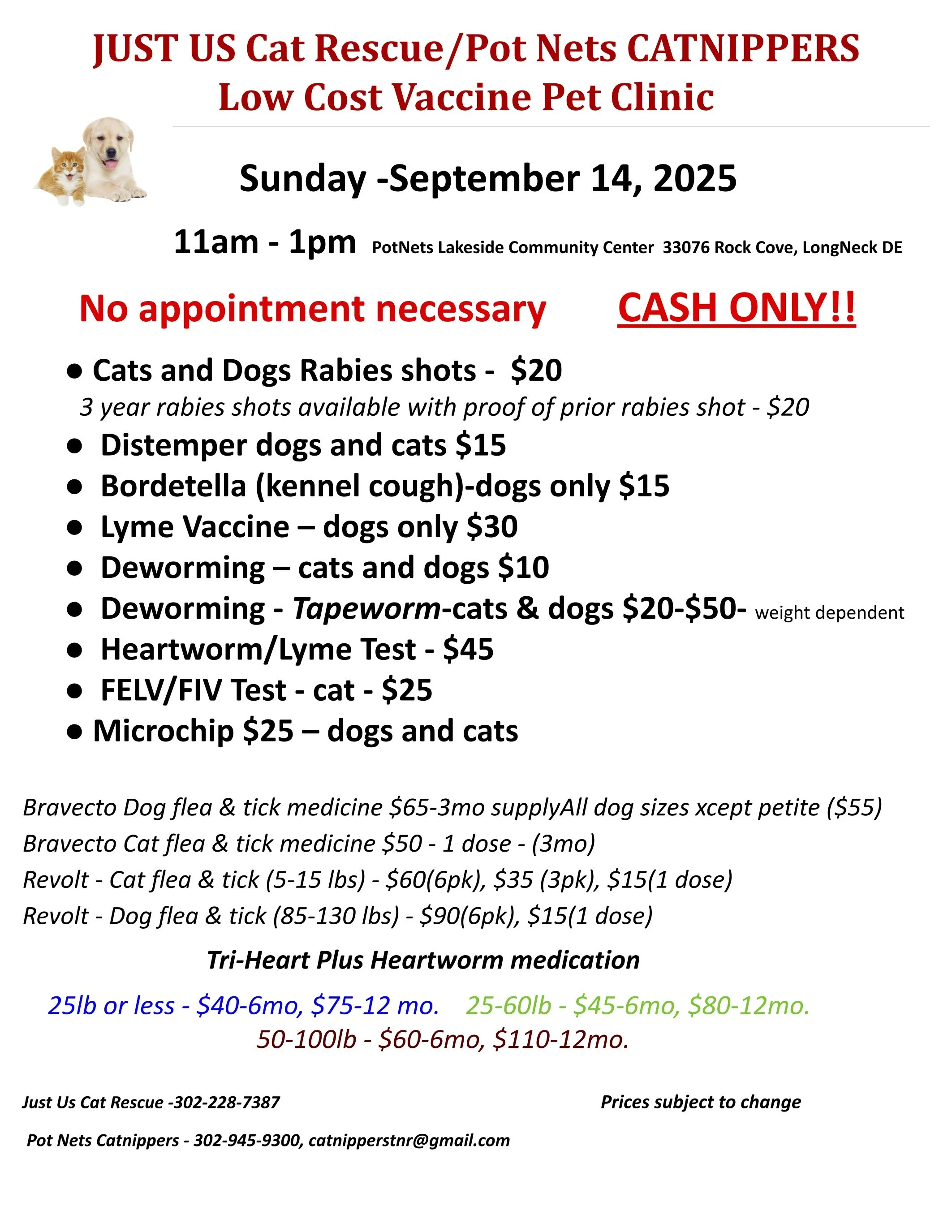 Join us for a pet clinic providing low-cost vaccines and medications. This clinic takes place on the second Sunday of every month (excluding August and December) from 11am to 1pm at the PotNets Lakeside Community Center.
